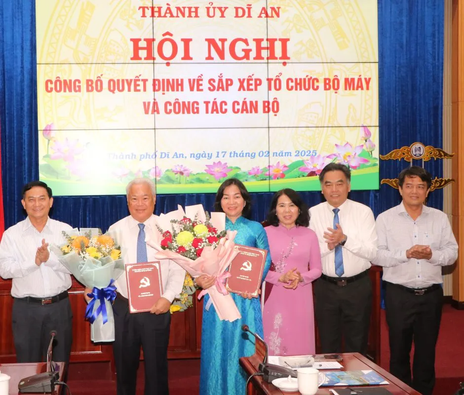 Hội nghị đã công bố quyết định của Ban chấp hành Trung ương Đảng về việc thôi giữ chức vụ, nghỉ hưu trước tuổi đối với ông Hồ Quang Điệp, Ủy viên Thường vụ Tỉnh ủy, Bí thư Thành ủy Dĩ An, kể từ ngày 15-2-2025; quyết định của Tỉnh ủy Bình Dương về việc điều động đồng chí Trương Thị Bích Hạnh, Ủy viên Thường vụ Tỉnh ủy đến nhận công tác tại Thành ủy Dĩ An, chỉ định tham gia Ban Chấp hành, Ban Thường vụ Thành ủy và giữ chức Bí thư Thành ủy Dĩ An nhiệm kỳ 2020 - 2025, kể từ ngày 15-2-2025.