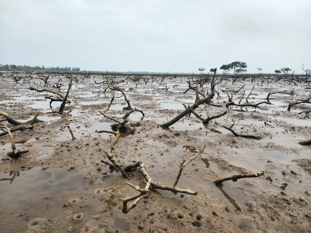 Đứng trên tuyến đê biển xung yếu Hải - Hà - Thư (xã Kỳ Hà) nhìn xuống, chúng tôi ghi nhận hàng chục ha rừng cây ngập mặn phía ngoài đê ven cửa biển trước đây từng phát triển xanh tốt, sum suê, ngút ngàn nhưng nay đã chết sạch. Cả một khu vực rộng lớn nay chỉ còn thấy những bãi bồi bùn đất lầy lội, hoang tàn với bạt ngàn xác cây mắm biển đủ các kích thước khác nhau bị chết khô, gãy đổ ngổn ngang.
