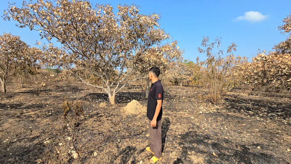 Theo anh Phan Văn Lý, ngày 15-3, anh bị đau nên ở nhà, không ra rẫy. Đến ngày 16-3, khi tới thăm rẫy, anh thấy cả vườn điều rộng 1,6ha bị lửa thiêu cháy rụi. Trong đó có 150 cây điều trên 12 năm tuổi đang chuẩn bị cho thu hoạch bị chết cháy, gây thiệt hại hàng trăm triệu đồng.