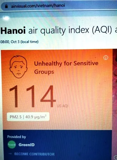 Theo kết quả quan trắc không khí tự động được Chi Cục bảo vệ Môi trường Hà Nội công bố, chỉ số chất lượng không khí AQI vào sáng nay 3-10 tại Hà Nội là 121, nồng độ bụi mịn PM2.5 là 37,4 µg/m3. Đối chiếu với số liệu quan trắc của Tổ chức Air Visual công bố vào lúc 8 giờ sáng nay thì ô nhiễm không khí ở Thủ đô cũng đã giảm đi rất nhiều so với những ngày trước khi chỉ số AQI chỉ là 114 và nồng độ bụi mịn PM2.5 là 40,9 µg/m3.