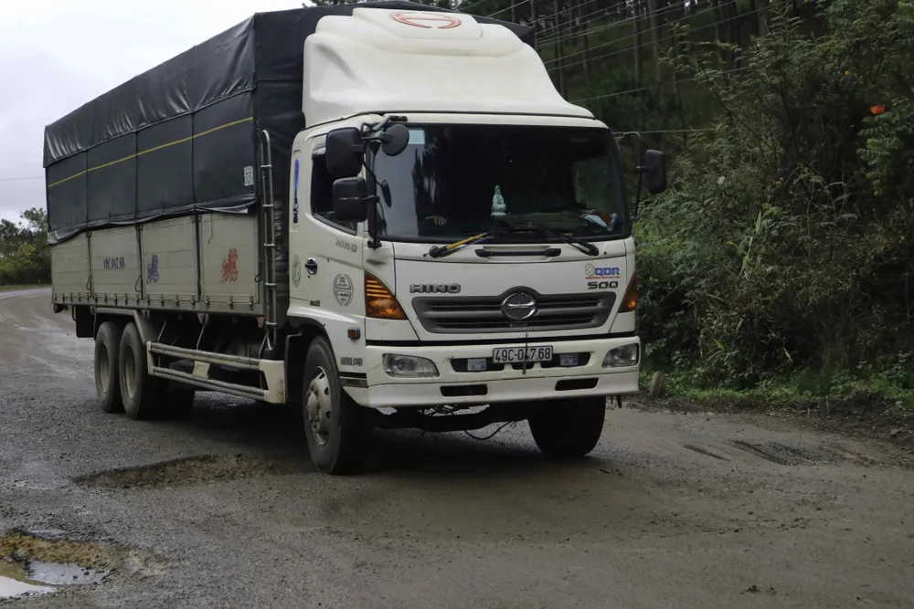 Phương tiện vận tải di chuyển vất vả qua những hố sâu. Ảnh: ĐOÀN KIÊN