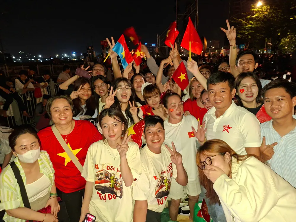 Cờ đỏ sao vàng cầm trên tay, đầu đội chiếc nón tai bèo, mặc áo Cờ đỏ sao vàng, hai gò má cũng được điểm trang hình lá cờ đỏ thắm, bà Dương Thị Kim Dung (kiều bào, ngụ quận 3, TPHCM) năm nay 70 tuổi, bày tỏ niềm xúc động và hạnh phúc vỡ òa khi được hòa mình vào không khí rộn ràng, phấn khởi của ngày hội lớn của đất nước Việt Nam.