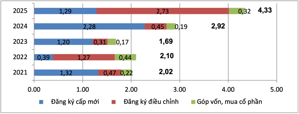Về vốn đăng ký điều chỉnh, có 137 lượt dự án đã cấp phép từ các năm trước, đăng ký điều chỉnh vốn đầu tư tăng thêm 2,73 tỷ USD, gấp 6,1 lần so với cùng kỳ năm trước.