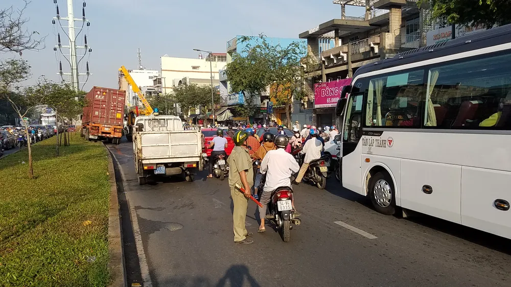 Trưa ngày 25-1, Công an quận 11, TPHCM mới giải quyết xong vụ xe container gặp sự cố tông vào dải phân cách khiến cho giao thông qua khu vực ùn ứ gần 5 giờ đồng hồ.