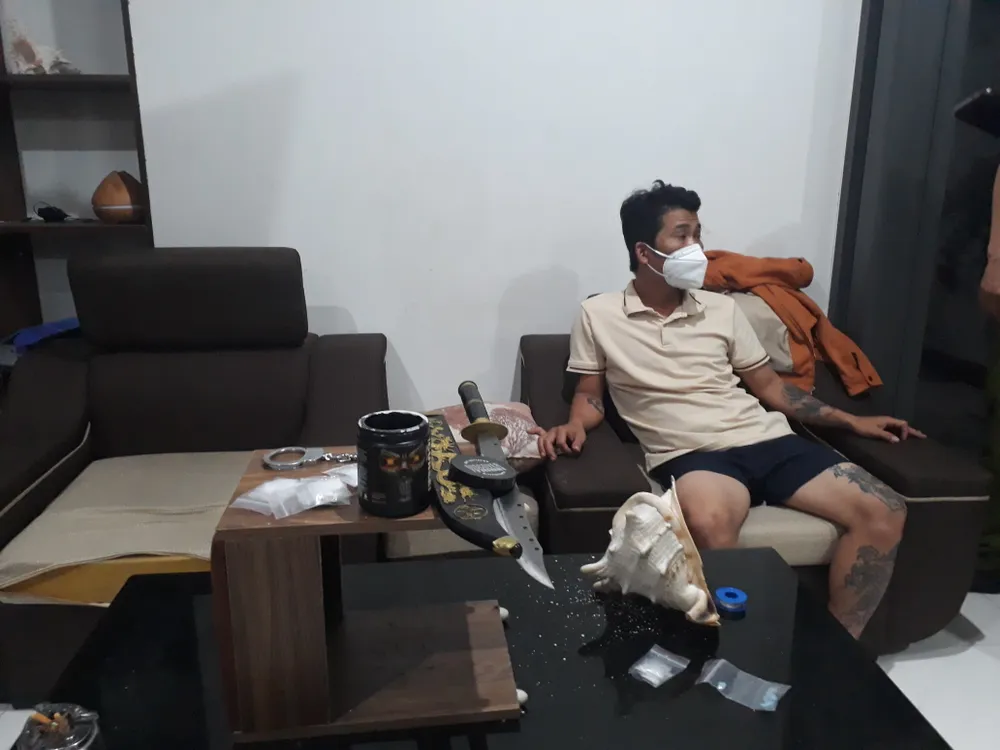 Ngoài ra, kiểm tra tại phòng bếp của cơ sở phát hiện 11 viên nén màu xanh nước biển có khối lượng 7,75gam, 46,3 gam tinh thể màu trắng, 1 còng số tám và 1 mã tấu dài 50cm.
