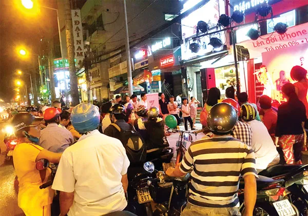 Cửa hàng điện máy ở góc đường Trần Hưng Đạo - Lê Hồng Phong, quận 1, TPHCM ngang nhiên tổ chức chương trình giới thiệu sản phẩm điện thoại mới trên vỉa hè vào tối 17-2-2017, gây ùn tắc giao thông. Ảnh: KHẮC HÀO
