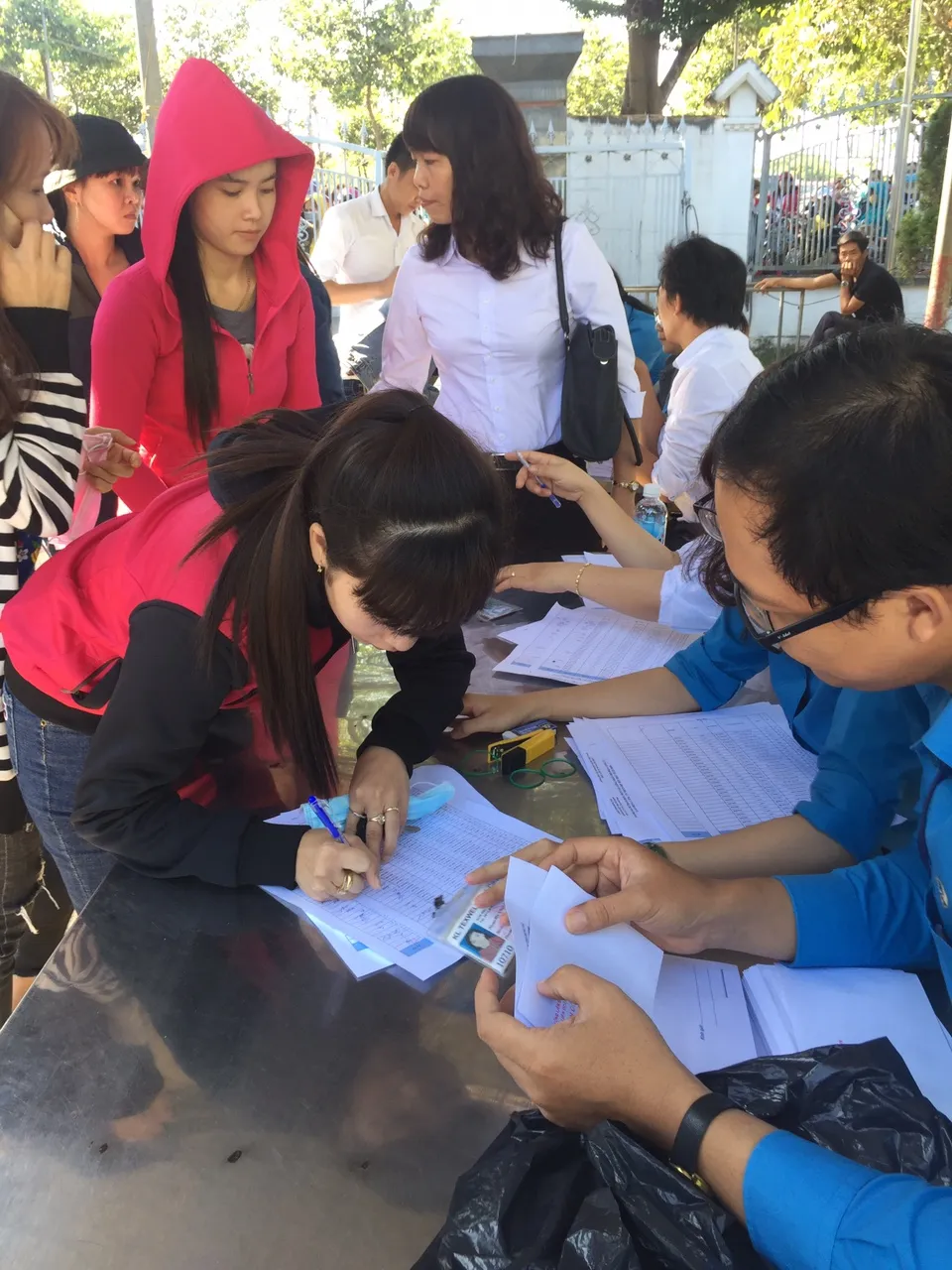 Từ sáng sớm, cả nghìn công nhân có mặt trước cổng công ty để chờ đợi nhận tiền hỗ trợ.  Công nhân rất mừng khi hôm trước vừa được nhận nửa số lương tháng 1 hôm nay lại được nhận thêm tiền hỗ trợ.
