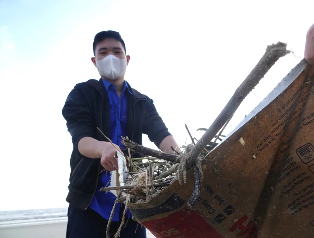 Thanh niên dọn rác ở bãi biển Sơn Thủy (quận Ngũ Hành Sơn). Ảnh: XUÂN QUỲNH |