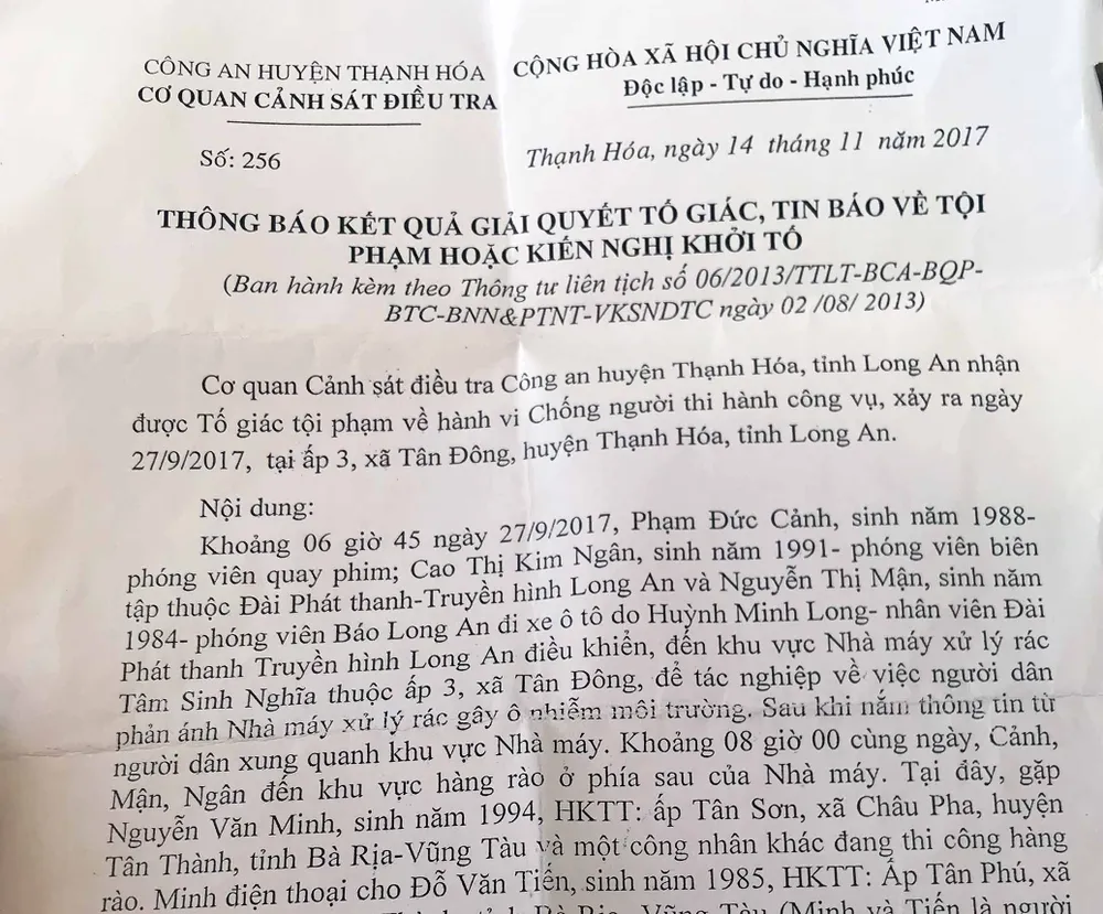 Theo Công an huyện Thạnh Hóa, hành vi hành hung của 2 đối tượng này đối với 3 phóng viên trên là “hành vi không cấu thành tội phạm”, nên Cơ quan CSĐT Công an huyện Thạnh Hóa không khởi tố vụ án.