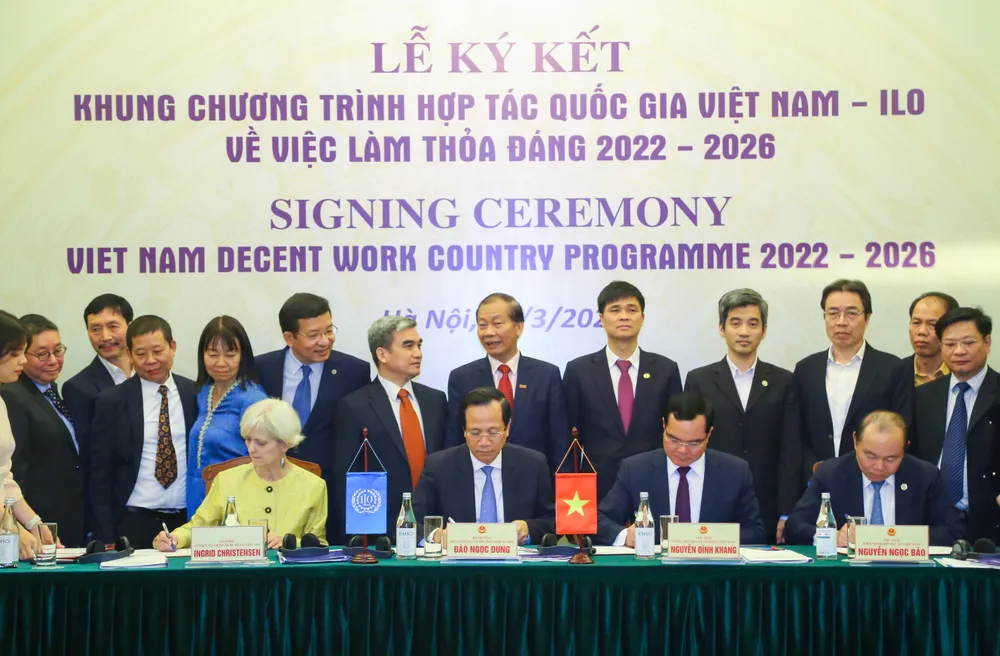 Chiều 28-3 tại Hà Nội, Bộ trưởng Bộ LĐTB-XH Đào Ngọc Dung, Chủ tịch Tổng Liên đoàn Lao động Việt Nam Nguyễn Đình Khang, Chủ tịch Liên đoàn Thương mại và Công nghiệp Việt Nam Phạm Tấn Công, Chủ tịch Liên minh Hợp tác xã Việt Nam Nguyễn Ngọc Bảo và Giám đốc Tổ chức Lao động quốc tế (ILO) tại Việt Nam Ingrid Christensen đã cùng ký kết vào Bản ghi nhớ của Khung chương trình hợp tác quốc gia Việt Nam và ILO về việc làm thỏa đáng (chu kỳ 2022-2026).