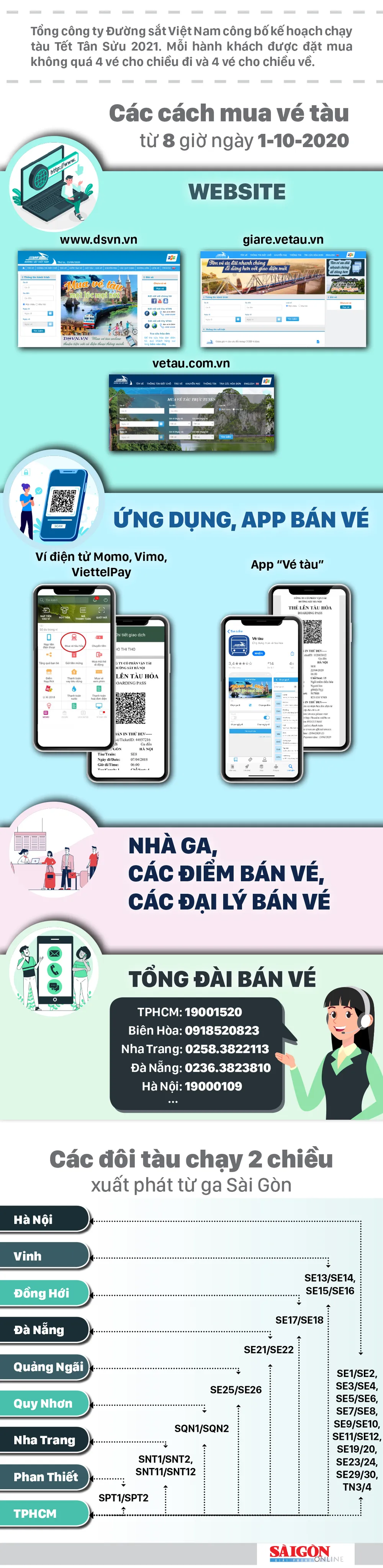 Từ 1-10-2020 bắt đầu bán vé tàu Tết Tân Sửu. Tổng Công ty Đường sắt Việt Nam công bố kế hoạch chạy tàu Tết Tân Sửu 2021. Mỗi hành khách được đặt mua không quá 4 vé cho chiều đi và 4 vé cho chiều về.