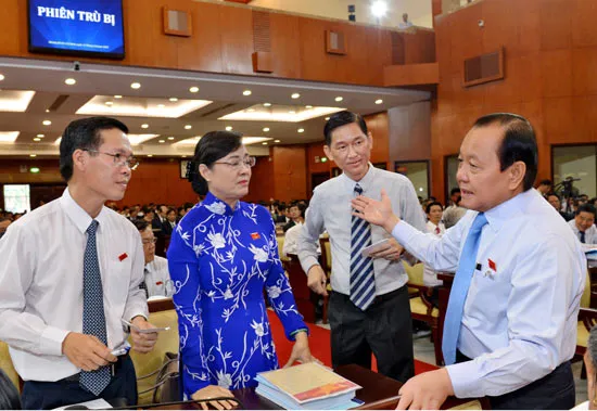 Bí thư Thành ủy TPHCM Lê Thanh Hải trao đổi cùng các đồng chí lãnh đạo TPHCM tại phiên trù bị Đại hội Đại biểu Đảng bộ TPHCM. Ảnh: VIỆT DŨNG