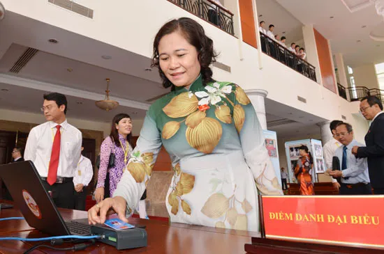 Đại biểu điểm danh bằng thẻ từ. Ảnh: VIỆT DŨNG