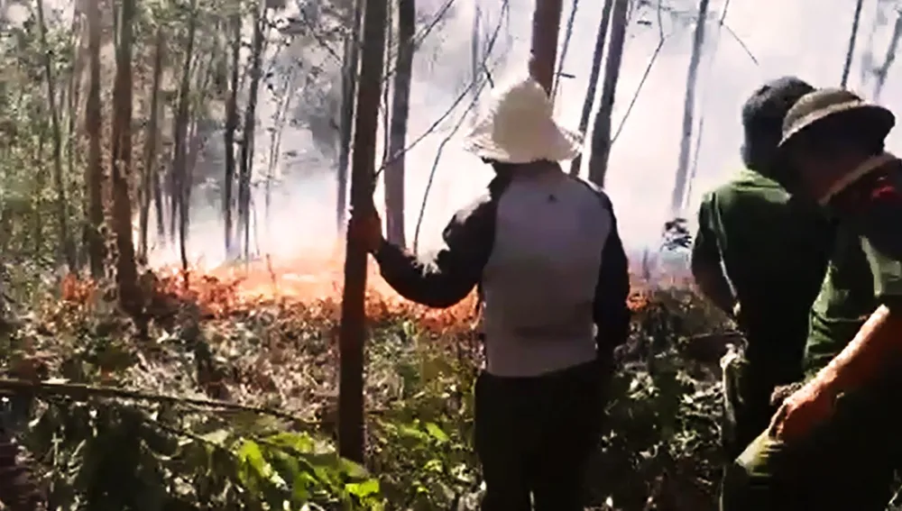 Chủ tịch UBND xã Bình Tân cũng cho biết, khu vực rừng bị cháy nằm xa khu dân cư, các phương tiện cơ giới không thể tiếp cận được nên phải chữa cháy bằng các công cụ thô sơ như đào đường băng, khoanh vùng, dùng lá đập…