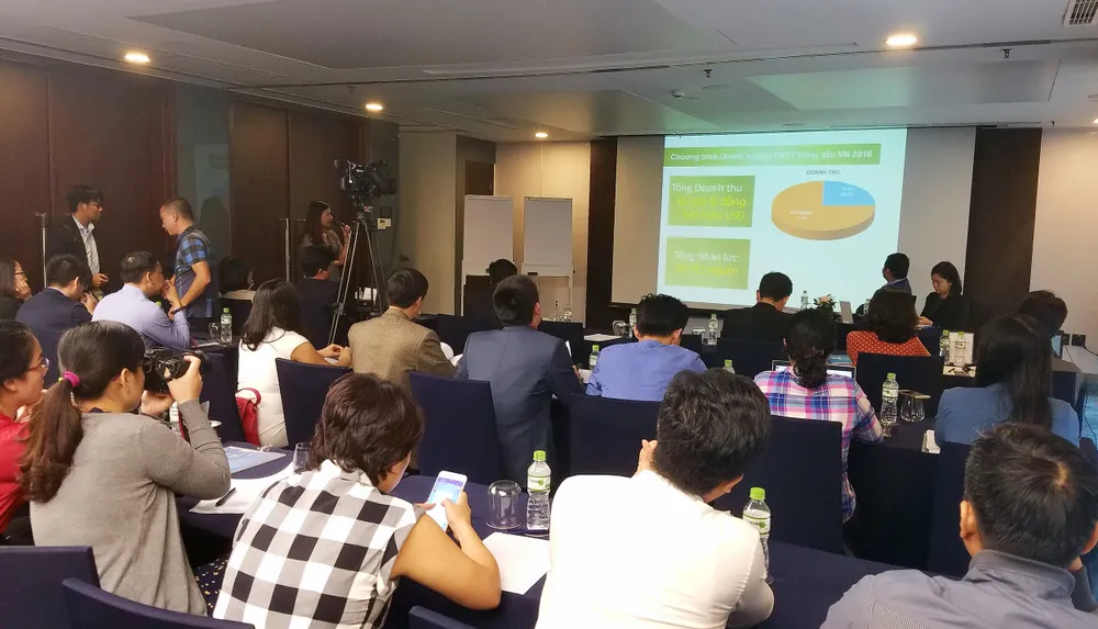 Buổi họp báo công bố 50 Doanh nghiệp CNTT hàng đầu Việt Nam 2017 sáng 19-10, tại Hà Nội. Ảnh: TRẦN BÌNH