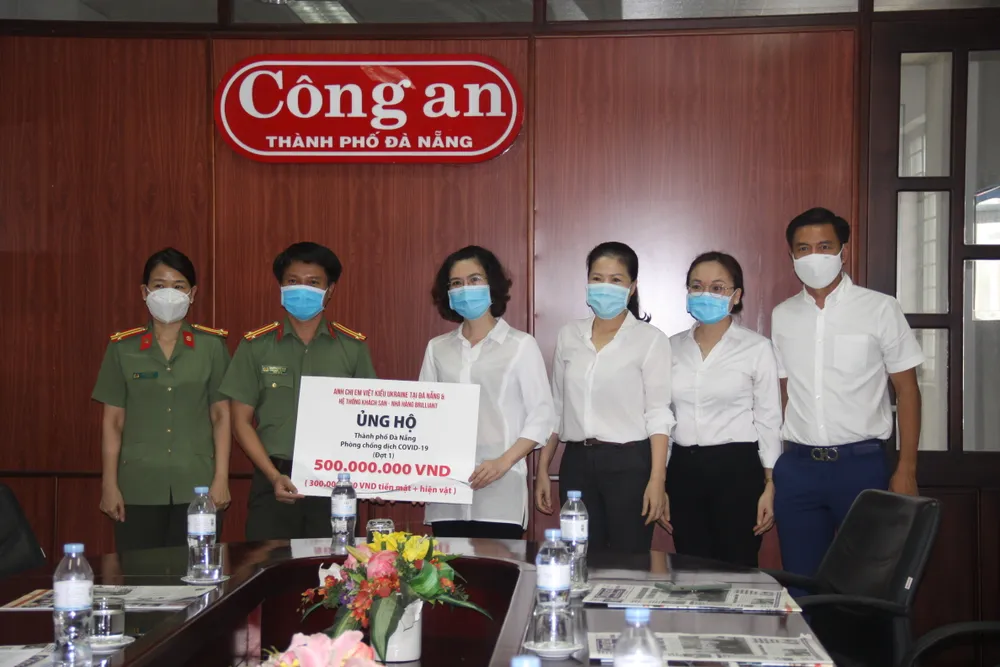 Trung tá Nguyễn Quang Sang, Phó Tổng biên tập phụ trách Báo Công an TP Đà Nẵng tiếp nhận 500 triệu đồng từ nhóm Việt kiều Ukraine tại Đà Nẵng và hệ thống khách sạn-nhà hàng Brilliant trao tặng các tuyến đầu chống dịch