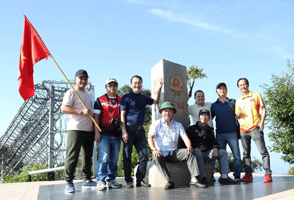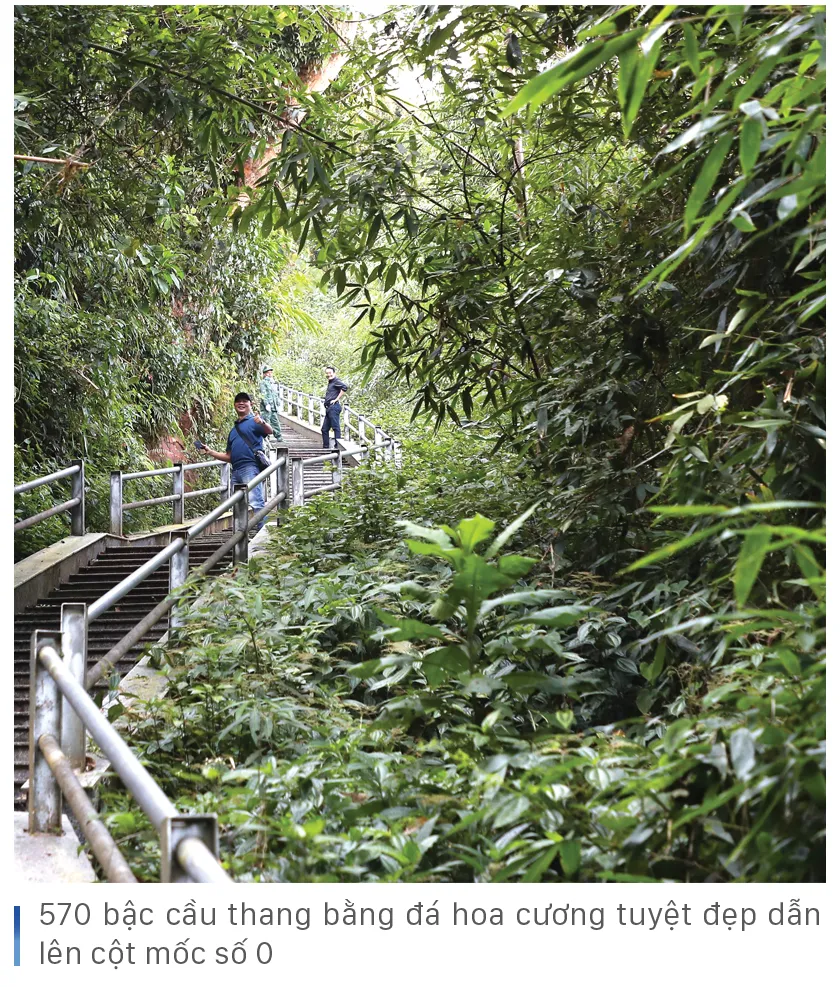 Dừng xe, nghỉ ngơi chút ít, chúng tôi bắt đầu chinh phục hơn 570 bậc cầu thang bằng đá hoa cương dẫn lên mốc số 0. Nếu chặng đường từ đồn biên phòng tới chân cột mốc là sự thử thách không hề nhỏ đối với những ai thích khám phá, mạo hiểm, việc leo bậc thang để lên tới cột mốc đòi hỏi chúng tôi sức khỏe dẻo dai.