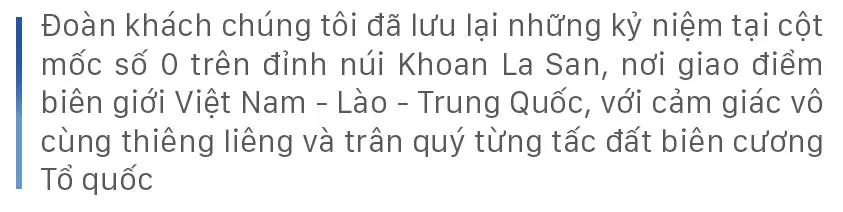 Sau chặng đường leo núi cũng không kém gian nan, cuối cùng chúng tôi cũng lên tới đỉnh Khoan La San trong ánh nắng vàng rực ngày cuối thu. Được ôm cột mốc số 0 nơi giao điểm biên giới Việt Nam - Lào - Trung Quốc, mọi cảm giác mệt mỏi đều tan biến, tất cả chúng tôi vỡ òa xúc động và tự hào khi mong muốn chinh phục được cực Tây của Tổ quốc thành hiện thực. Giữa cái mênh mông, hùng vĩ của núi rừng Tây Bắc trùng trùng điệp điệp, được khoác lên mình lá cờ đỏ sao vàng đứng bên cạnh cột mốc số 0, thực sự đối với bất kỳ ai cũng đều dâng trào cảm giác vô cùng thiêng liêng và trân quý từng tấc đất biên cương Tổ quốc.