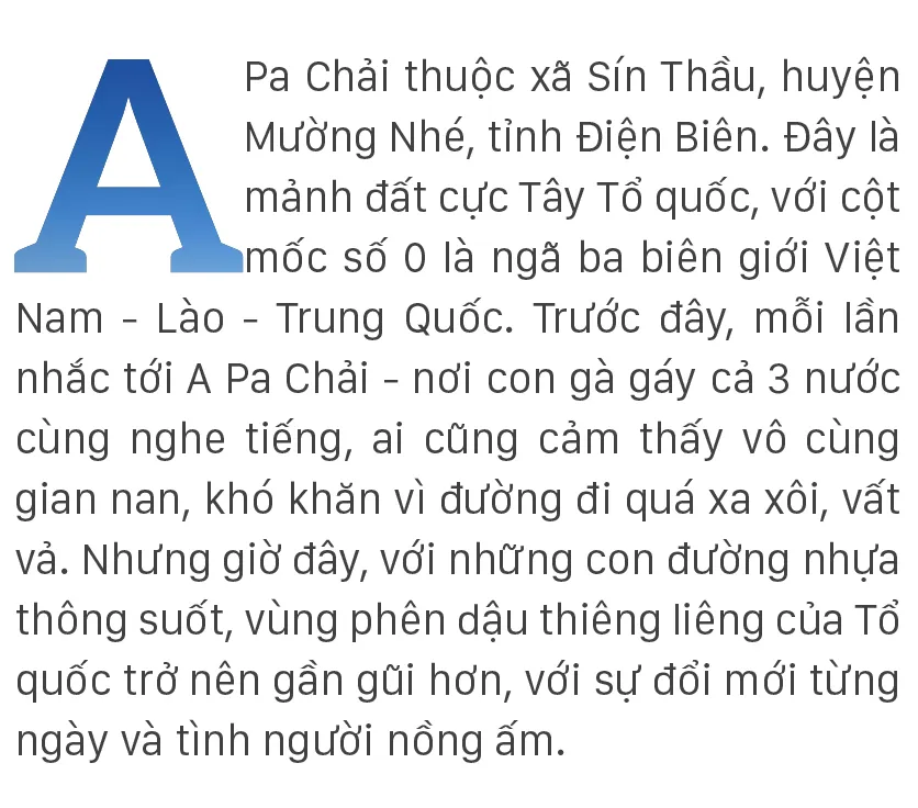 Sau cái bắt tay ấm áp, nồng nhiệt với những khách phương Nam đang ngỡ ngàng trước vẻ đẹp và sự trù phú của Sín Thầu, Trung tá Đặng Văn Tuấn, Đồn trưởng Đồn biên phòng A Pa Chải, chia sẻ theo tiếng của người Hà Nhì sinh sống tại Sín Thầu, A Pa Chải có nghĩa là “vùng đất bằng phẳng, rộng lớn”. Đồn biên phòng A Pa Chải có nhiệm vụ quản lý 40,5km đường biên giới tiếp giáp với Lào và Trung Quốc, trong đó có cột mốc số 0. Điều này đặt ra nhiệm vụ nặng nề cho không chỉ cán bộ, chiến sĩ của Đồn A Pa Chải mà cả bà con các dân tộc tại địa phương trong việc bảo vệ vững chắc biên cương, gìn giữ hòa bình, an ninh trật tự nơi phên dậu Tổ quốc. Vì thế, với bất kỳ ai muốn trải nghiệm, khám phá cột mốc số 0 này đều phải qua đồn biên phòng, sau đó sẽ được hỗ trợ về phương tiện và phân công chiến sĩ đưa lên mốc.