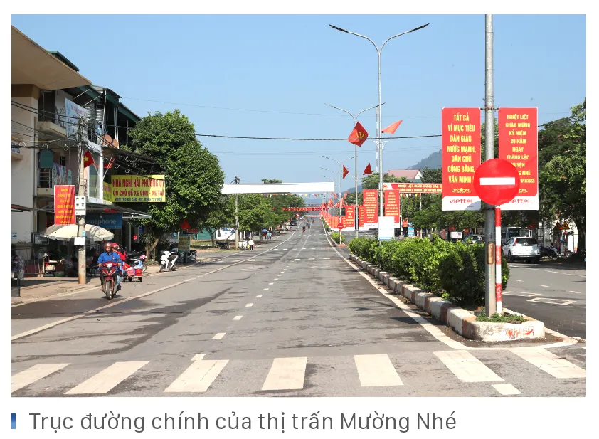 Hành trình khám phá A Pa Chải của chúng tôi vào dịp cuối thu và đầu đông, thời tiết tuyệt đẹp, ban ngày nắng vàng ấm áp, rực rỡ trải khắp núi non hùng vĩ xen lẫn những thửa ruộng bậc thang đang mùa lúa chín báo hiệu “mùa vàng” bội thu. Tuyệt vời hơn, núi rừng Tây Bắc cuối thu, đầu đông cũng là thời điểm mùa hoa dã quỳ nở rộ vàng óng, trải dài bên những cung đường đèo dốc quanh co. Hoàng hôn buông xuống, mây mù bắt đầu giăng khắp miền sơn cước, cũng là lúc chúng tôi đến Km số 0 ở trung tâm huyện Mường Nhé. Phố huyện vùng cao đông vui và sầm uất chẳng kém gì dưới xuôi.