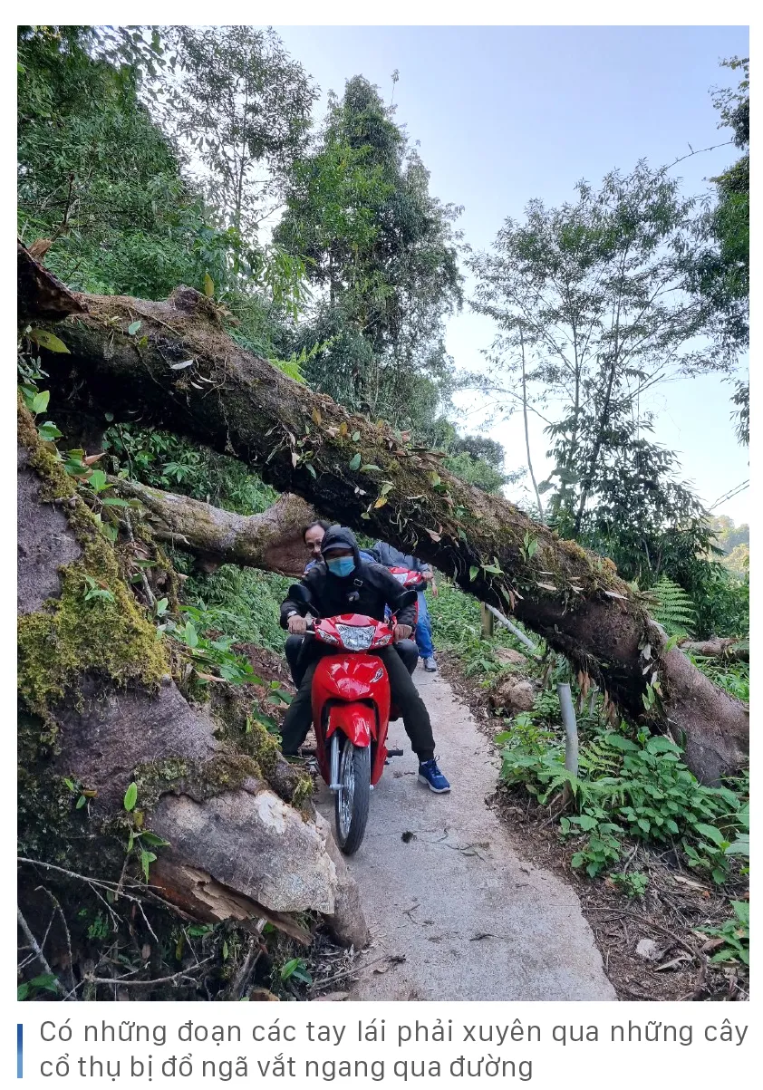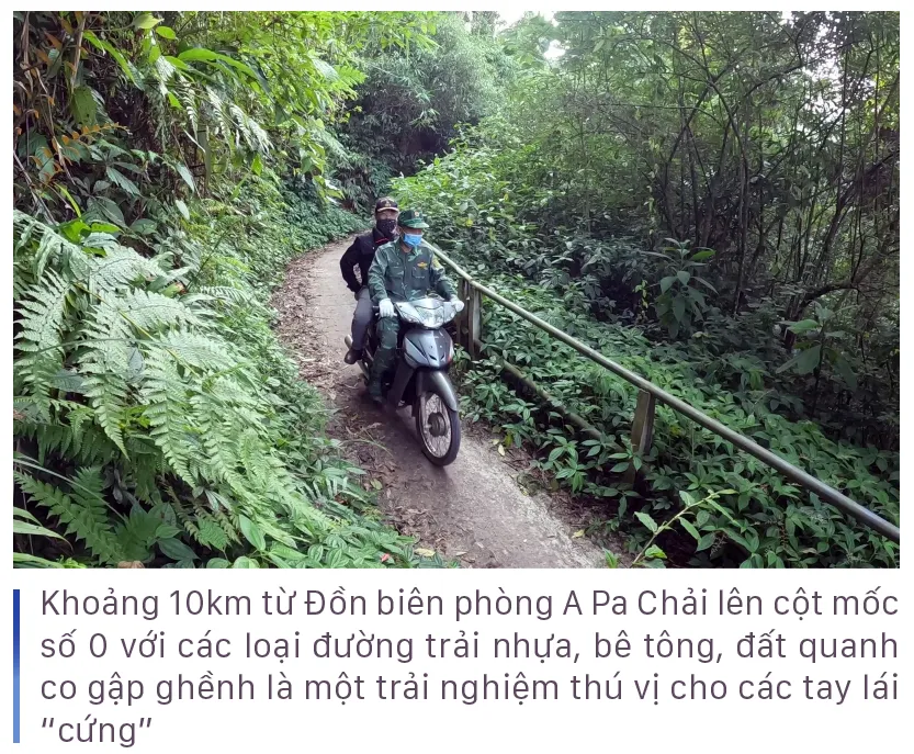 Sau nửa giờ chạy xe máy qua những cung đường quanh co rộng chừng 2m theo các vách núi, chúng tôi tới được điểm dừng chân ở lưng chừng núi, nơi có tấm bia đá khắc thông tin về cột mốc số 0. Dừng chân nghỉ ít phút, một cán bộ biên phòng dẫn đường nhắc nhở: “Bắt đầu từ đoạn này lên mốc, tất cả xe đều phải đi số 1 nhé, chỗ nào khó quá mọi người xuống dắt bộ và đẩy xe…”. Quả thực, từ trạm dừng nghỉ này lên tới chân cột mốc chỉ khoảng 3km nhưng là đường xuyên qua rừng già liên tục quanh co, gấp khúc bên vách núi cheo leo, thậm chí nhiều đoạn đường thắt lại rất nhỏ không chỉ dốc thẳng đứng còn trơn trượt, nên chỉ cần lỡ lạc tay lái là có thể lao thẳng xuống vực, nếu không cũng đâm vào vách núi. Chưa kể, thi thoảng, chúng tôi lại phải khom lưng để lách cả xe lẫn người chui qua những thân cây rừng bị gãy đổ chắn ngang đường đi, hoặc những tảng đá trên vách núi rơi xuống do sạt lở. Được sự hỗ trợ rất nhiệt tình của các chiến sĩ biên phòng, chỉ sau khoảng nửa giờ chúng tôi đã chạy xe tới được chân cột mốc.