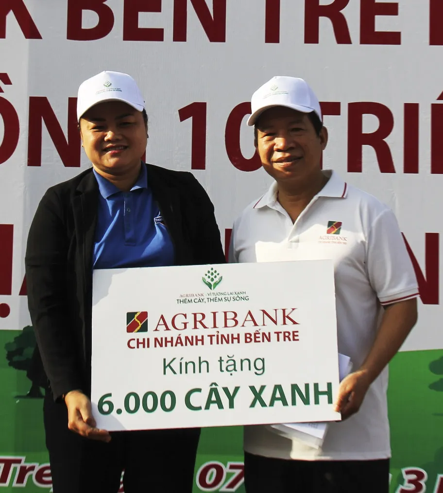 Đơn vị Agribank chi nhánh Bến Tre trao tặng bảng tượng trưng 6.000 cây xanh cho Đoàn khối Cơ quan - Doanh nghiệp tỉnh Bến Tre