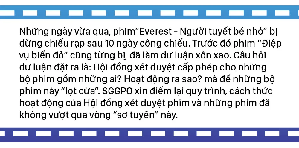 Những ngày vừa qua, phim “Everest - Người tuyết bé nhỏ” bị dừng chiếu rạp sau 10 ngày công chiếu. Trước đó phim “Điệp vụ biển đỏ” cũng từng bị, đã làm dư luận xôn xao. Câu hỏi dư luận đặt ra là: Hội đồng xét duyệt cấp phép cho những bộ phim gồm những ai? Hoạt động ra sao? mà để những bộ phim này “lọt cửa”.