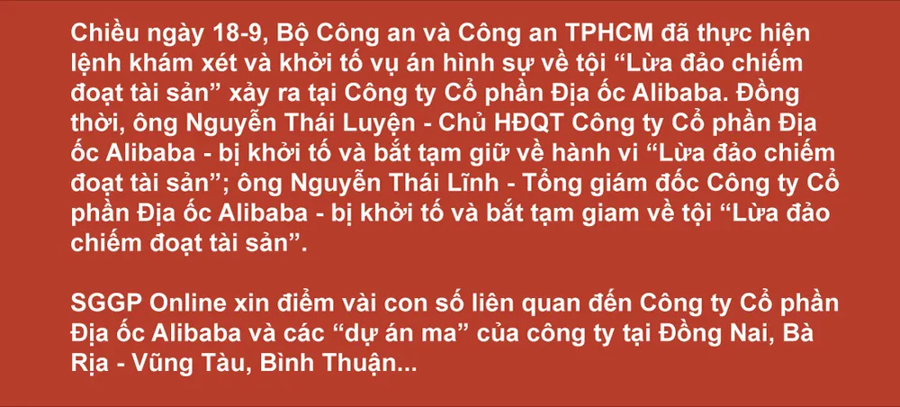 Chiều 18-9, Cơ quan công an đã thực hiện lệnh khám xét và khởi tố vụ án hình sự về tội "Lừa đảo chiếm đoạt tài sản" xảy ra tại Công ty CP Địa ốc Alibaba. SGGP Online xin điểm vài thông tin liên quan đến Công ty CP địa ốc Alibaba và các "dự án ma" của công ty này tại Đồng Nai, Bà Rịa - Vũng Tàu, Bình Thuận...