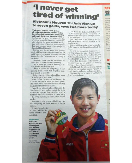 Bài về Ánh Viên đăng trên báo Singapore. Ảnh: DŨNG PHƯƠNG