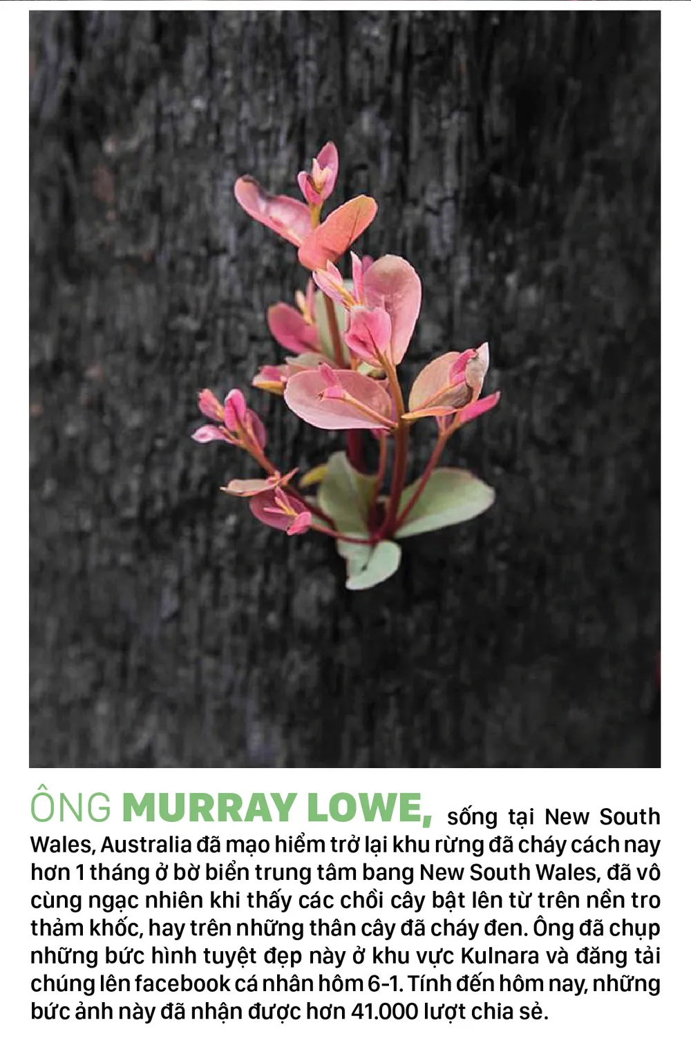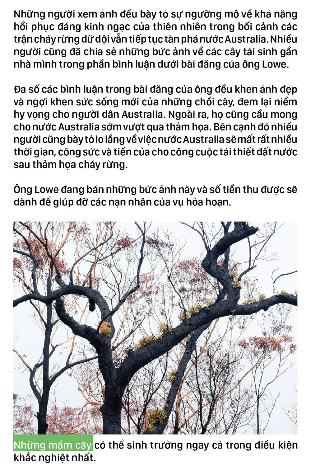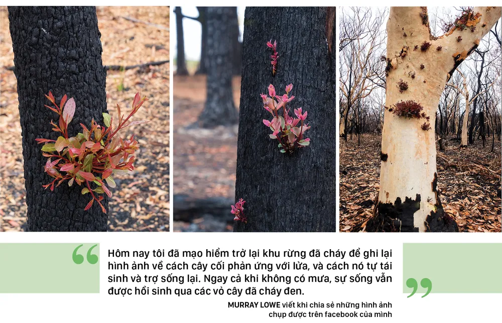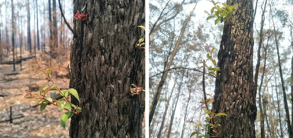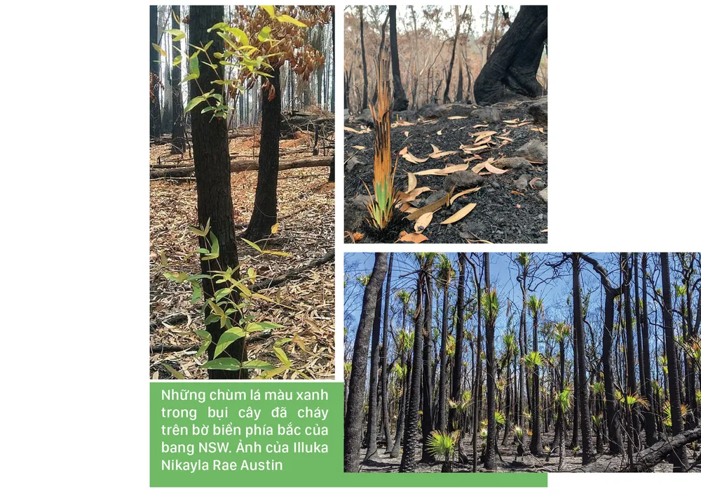 Những bức ảnh về sự hồi sinh mảnh liệt của những mầm cây bật lên từ trên nền tro thảm khốc, hay trên những thân cây đã cháy đen sau vụ cháy rừng tại Australia, đã đem lại niềm hy vọng cho người dân Australia.