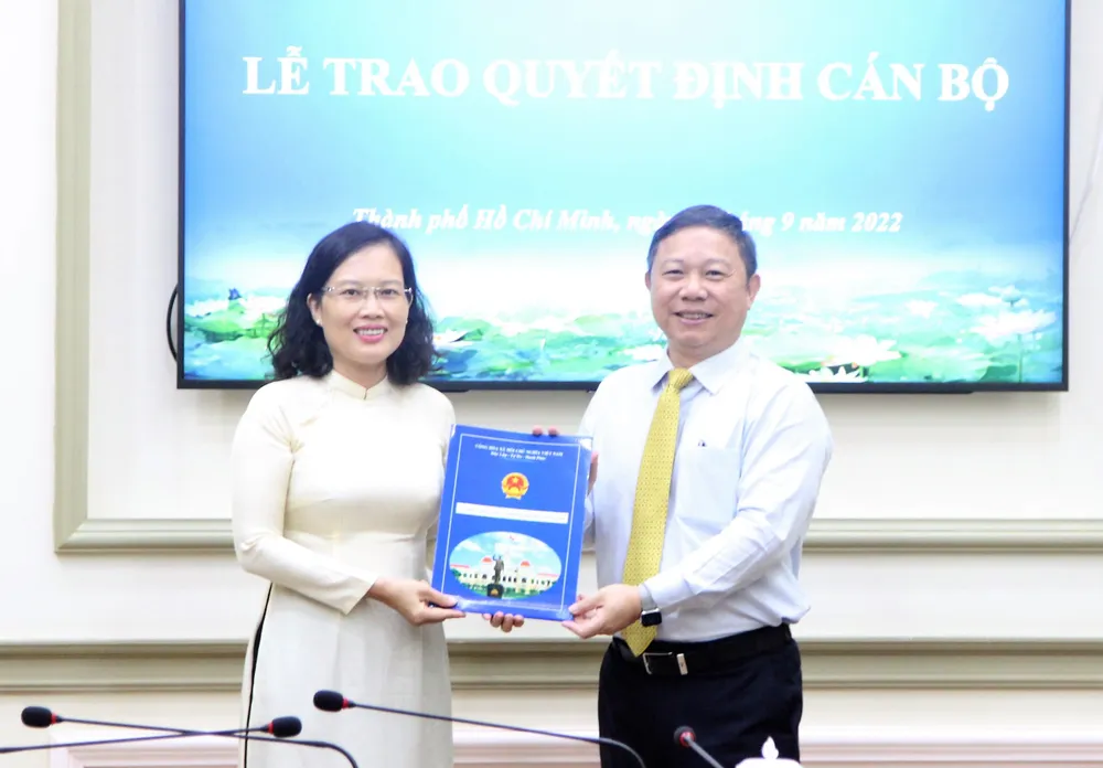 Phó Chủ tịch UBND TPHCM Dương Anh Đức trao quyết định tiếp nhận và bổ nhiệm cho bà Nguyễn Thị Minh Phượng. Ảnh: MAI HOA