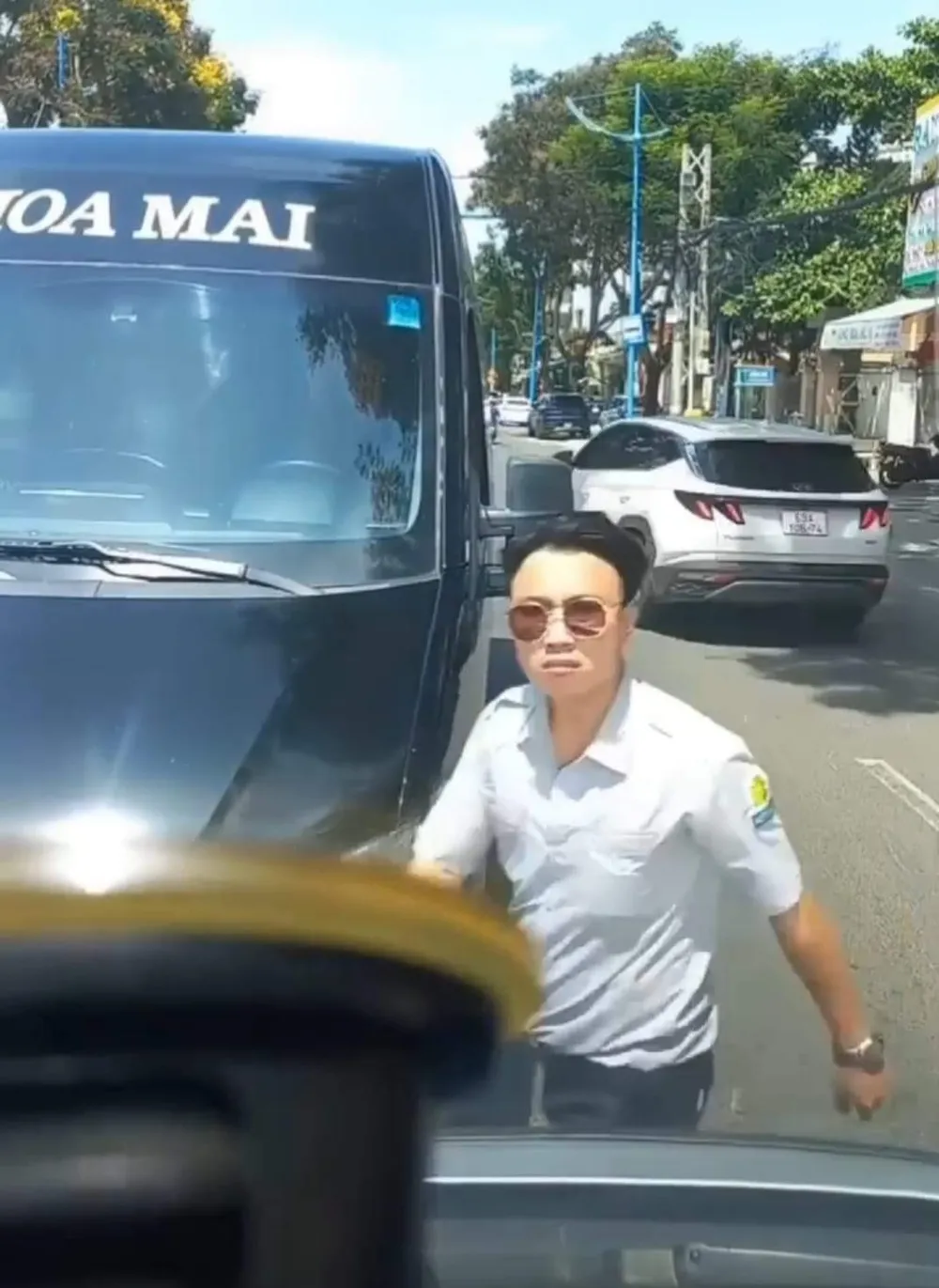 Lúc này, một xe khác đi chiều ngược lại không nhường đường nên tài xế đã dừng xe, bước xuống mở cửa xe đối diện và có thái độ hung hăng, chửi bới. Trước khi bỏ về xe mình, tài xế này còn đá vào xe đối diện và buông lời thách thức, dọa nạt.
