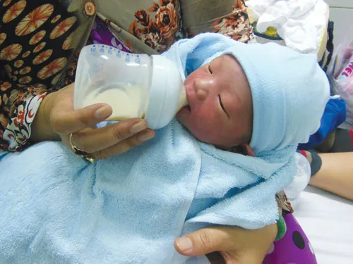 Chớ vội cho trẻ sơ sinh bú bình vì sợ bé đói, mà nên cho bé nút vú mẹ để kích thích sữa mẹ sớm ra. Ảnh chụp tại Bệnh viện Từ Dũ
