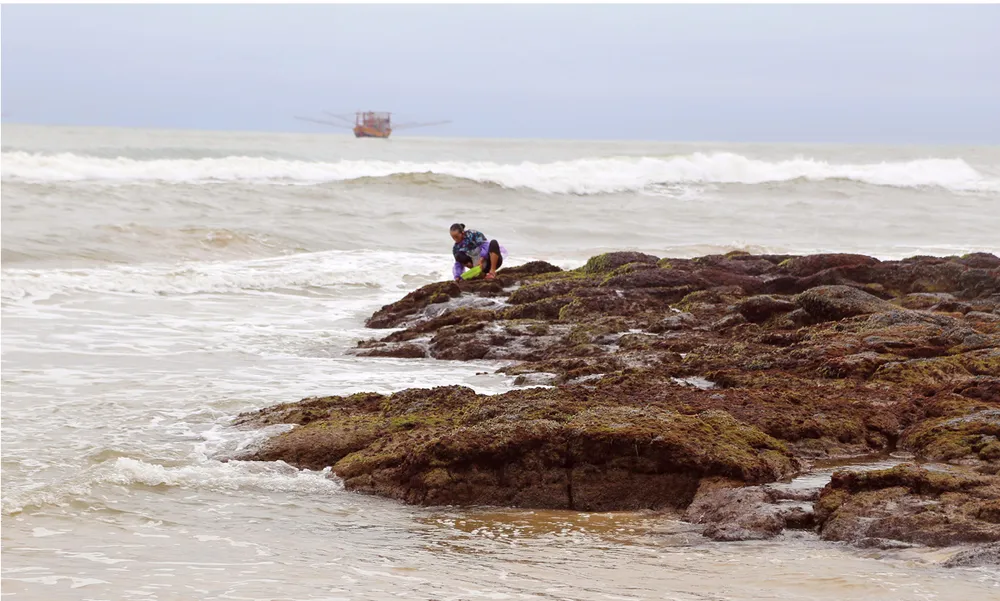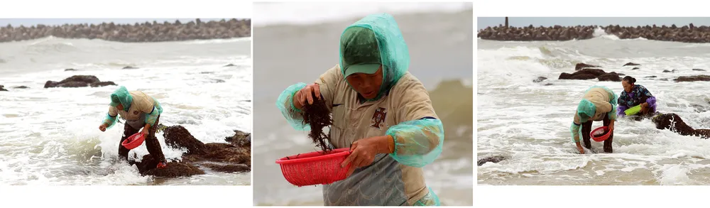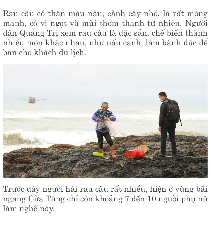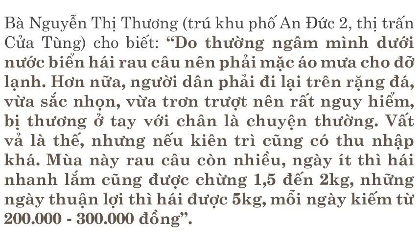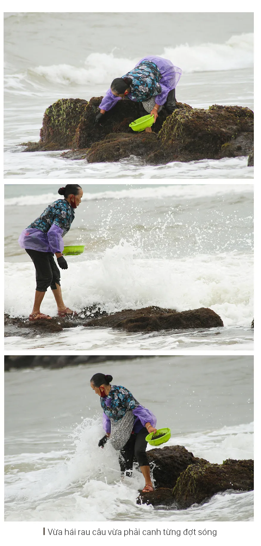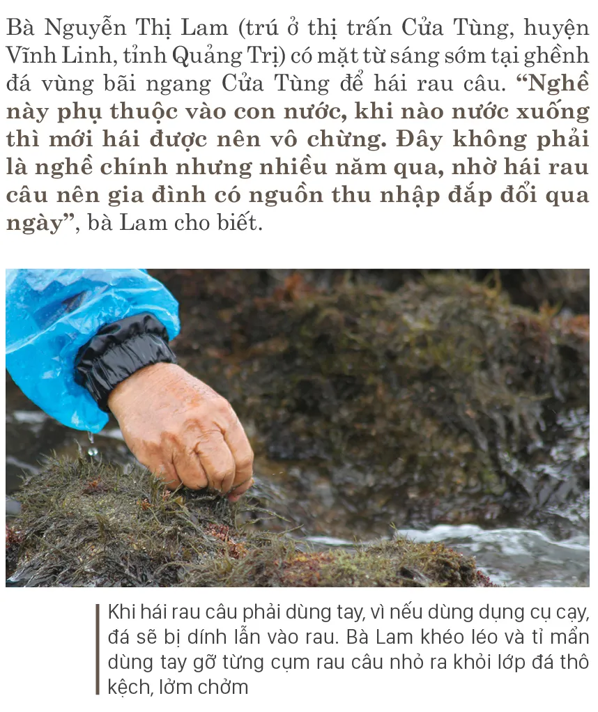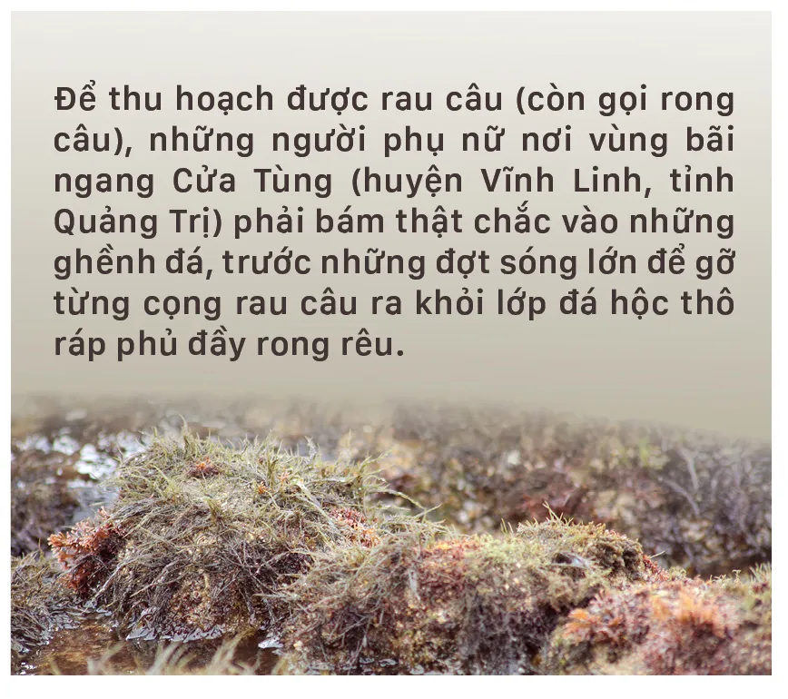 Để thu hoạch được rau câu (hay còn gọi rong câu), những người phụ nữ nơi vùng bãi ngang Cửa Tùng (huyện Vĩnh Linh, tỉnh Quảng Trị) phải bám thật chắc vào những ghềnh đá, gồng mình trước những đợt sóng lớn và dùng tay không để gỡ từng cọng rau câu ra khỏi lớp đá hộc thô ráp phủ đầy rong rêu.