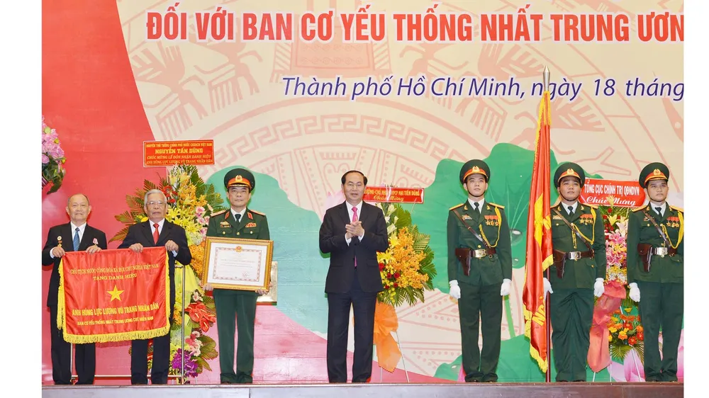 Chủ tịch nước Trần Đại Quang trao danh hiệu Anh hùng Lực lượng vũ trang nhân dân cho Ban Cơ yếu thống nhất Trung ương Cục miền Nam. Ảnh: Việt Dũng
