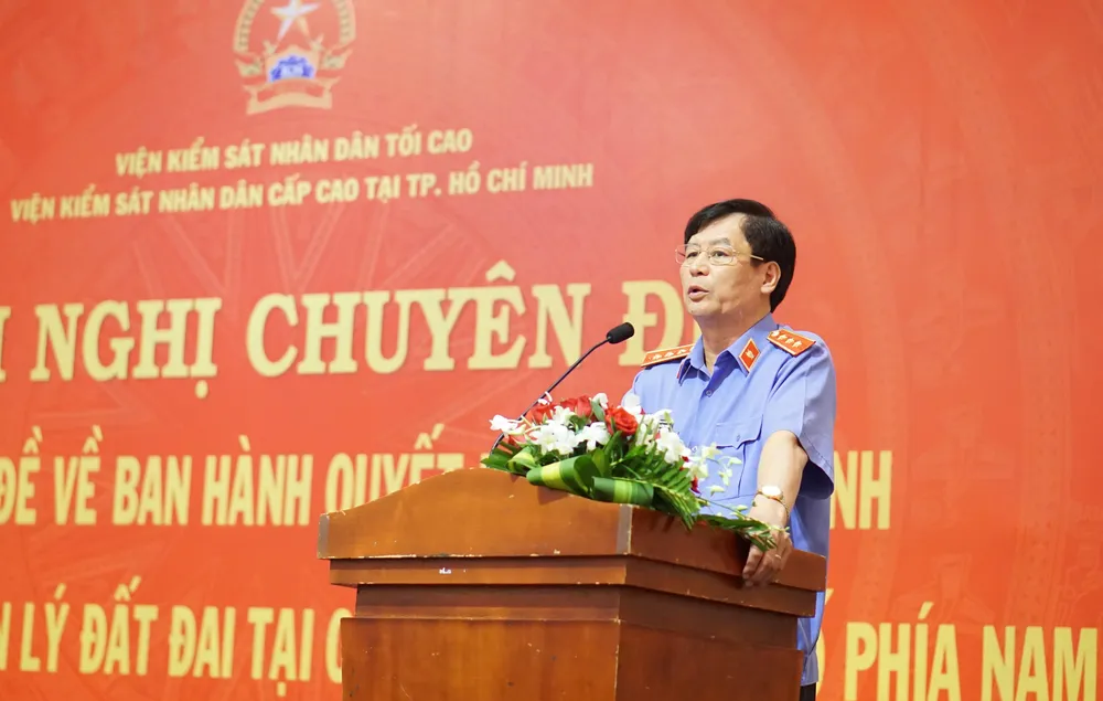 Phát biểu khai mạc hội nghị, Viện trưởng VKSND cấp cao tại TPHCM Nguyễn Đình Trung cho rằng, 23 tỉnh thành khu vực phía Nam là khu vực phát triển năng động, đầu tàu kinh tế cả nước. Việc các doanh nghiệp tập trung đầu tư vào các dự án đã góp phần phát triển kinh tế xã hội đất nước, nhưng cũng làm phát sinh nhiều khiếu nại khiếu kiện liên quan đất đai.