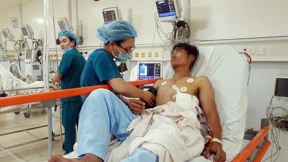 Nghe nạn nhân hô hoán, anh Ng.Đ.T. (27 tuổi, ngụ tỉnh Đồng Nai) lao xe vào 2 tên cướp để cản. Sau đó, anh Ng.Đ.T. bị 1 đối tượng dùng dao đâm trúng người gây thủng phổi. Anh Ng.Đ.T. được người dân đưa đi cấp cứu ở bệnh viện.
