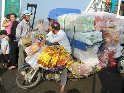 Ảnh được ghi nhận trên phà Bình Khánh. Chiếc xe gắn máy chở một lượng hàng hóa quá cồng kềnh có nguy cơ ảnh hưởng trực tiếp đến an toàn giao thông. Ông N.V.T., 42 tuổi, nhà ở xã Lý Nhơn, huyện Nhà Bè cho biết, số hàng hóa nêu trên sẽ được cung cấp cho các tiệm tạp hóa ở huyện Cần Giờ. Đề nghị các cơ quan chức năng tăng cường hơn nữa công tác tuần tra để kịp thời xử lý việc chở hàng hóa quá cồng kềnh như trên.