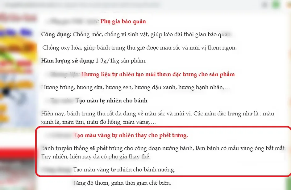 Đặc biệt, trên một trang rao bán nguyên liệu làm bánh trung thu có tên phugiaxxx.com rao bán các nguyên liệu làm bánh trung thu "hoàn toàn tự nhiên" nhưng lại có cả hương liệu thực phẩm, chất điều vị, chất bảo quản tự nhiên, màu thực phẩm, phụ gia thực phẩm cao cấp… (?)