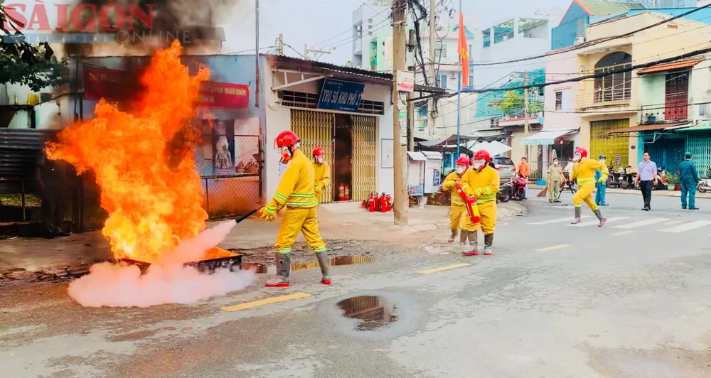 Tổ phản ứng nhanh lực lượng vũ trang PCCC-CNCH diễn tập chữa cháy ở quận Tân Phú. Ảnh: CHÍ THẠCH |