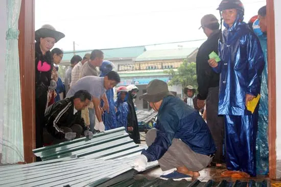 Người dân xã Hải Thọ, huyện Hải Lăng, Quảng Trị nhận tấm tôn lợp từ đoàn từ thiện