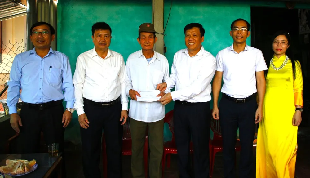 Phó Tổng Biên tập Báo SGGP (thứ 3 từ trái sang) và lãnh đạo địa phương thăm hỏi, trao tiền hỗ trợ cho gia đình ông Lê Văn Sáng |