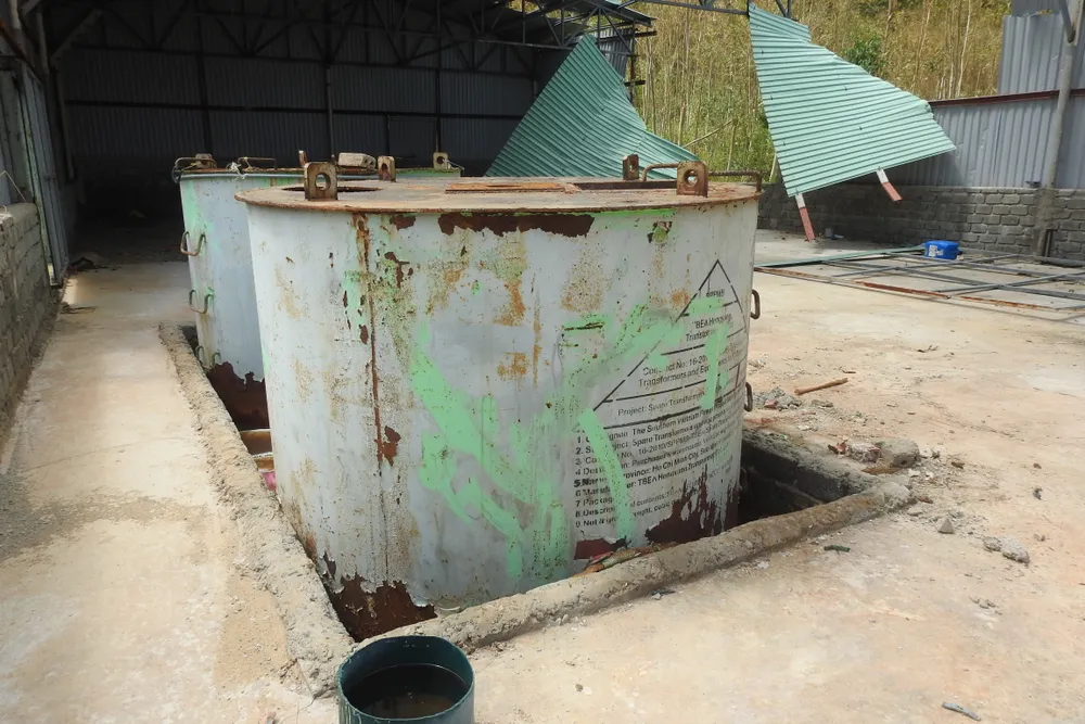 Cạnh đó, ông Đinh cho biết, cặn hóa chất ở hai bồn sắt được vớt ra, đóng cứng như vỉa san hô. Bên ngoài nhà xưởng nước tù đọng, người dân cho hay đấy là nước hóa chất chảy ra đóng đen, mùi khó chịu.