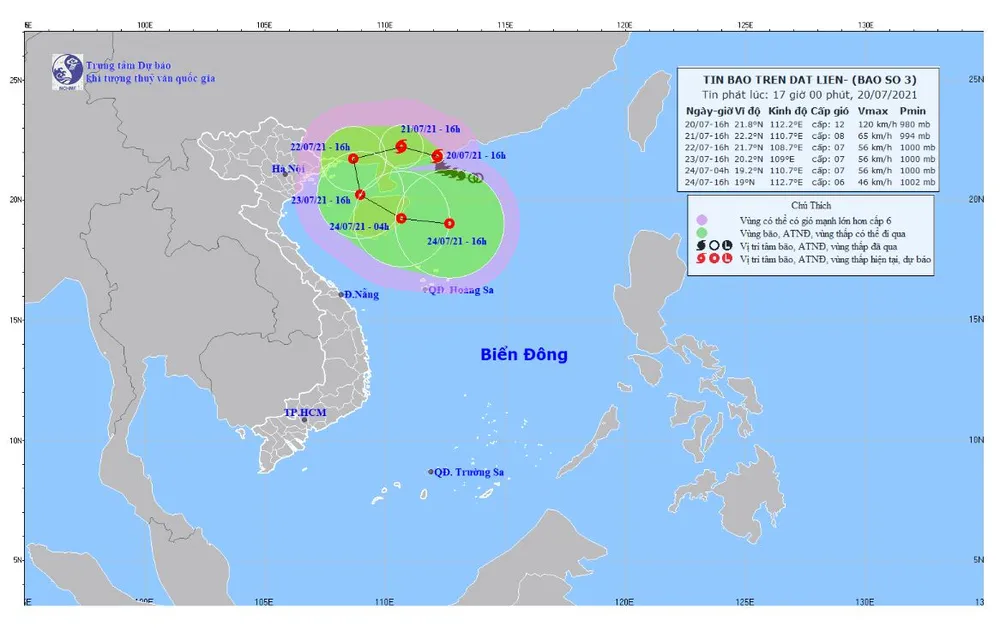 Dự báo trong 24 giờ tới, bão di chuyển theo hướng Tây Tây Bắc, mỗi giờ đi được khoảng 5km. Đến chiều mai 21-7, tâm bão nằm trên đất liền phía Nam tỉnh Quảng Đông - Quảng Tây (Trung Quốc), cách Móng Cái (Quảng Ninh) khoảng 300km về phía Đông Đông Bắc. Sức gió giảm còn cấp 8 (60-75km/giờ), giật cấp 10.