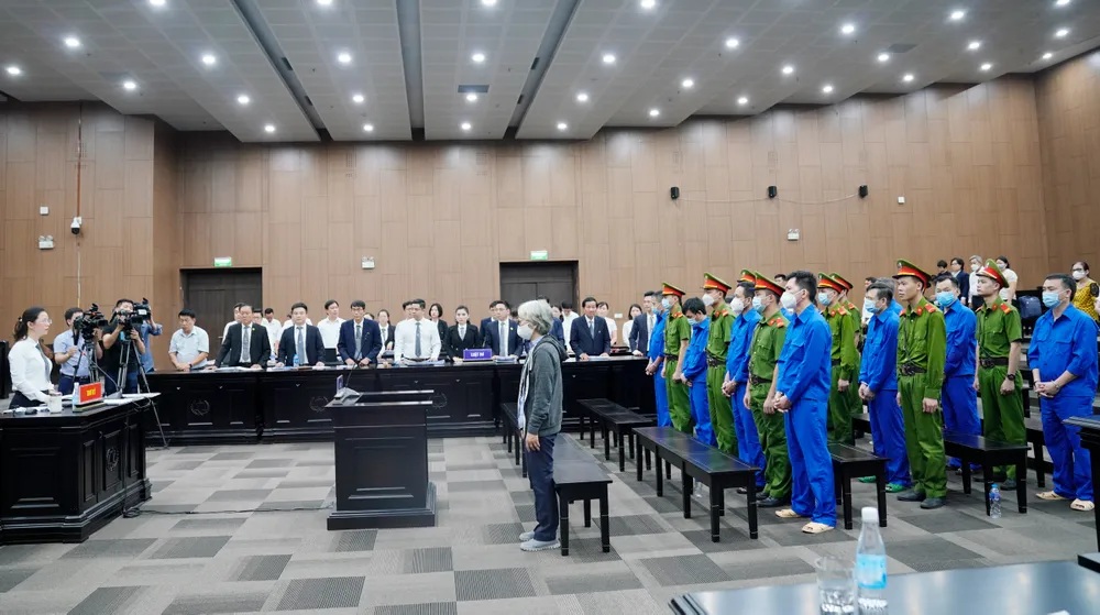 Trong trang phục màu xanh phạm nhân, các bị cáo nhanh chóng được lực lượng công an dẫn giải lên phòng xét xử.