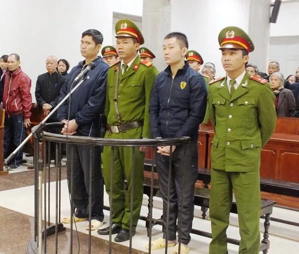 Bị cáo Tường và Khánh trong phiên tòa sơ thẩm sáng nay, 4-12