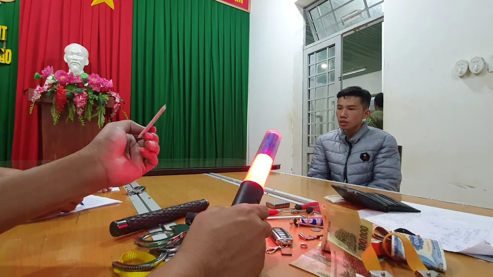Khám xét trên người Sang, lực lượng công an thu giữ 1 còng số 8, 1 cây dùi cui, 1 cây gậy giao thông, 1 cái còi và 200 ngàn đồng Sang vừa cưỡng đoạt được.