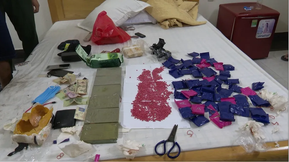 Tiến hành khám xét tại hiện trường, lực lượng chức năng đã thu giữ 6 bánh heroin, 1kg ketamine và 12.000 viên ma túy tổng hợp (hồng phiến).