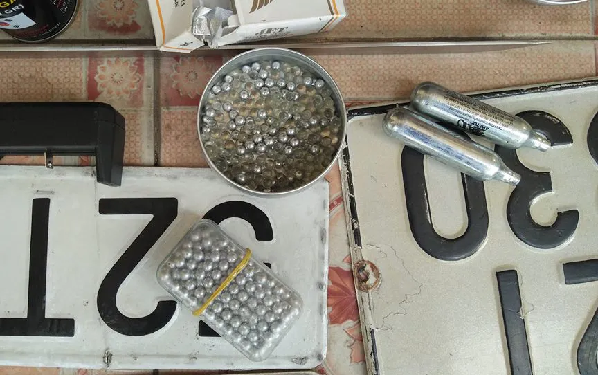 Khám nơi ở của các nghi can, công an thu giữ nhiều biển số ô tô, mã tấu, bình nén gas dùng cho súng bắn đạn bi cùng hàng trăm viên đạn bi.