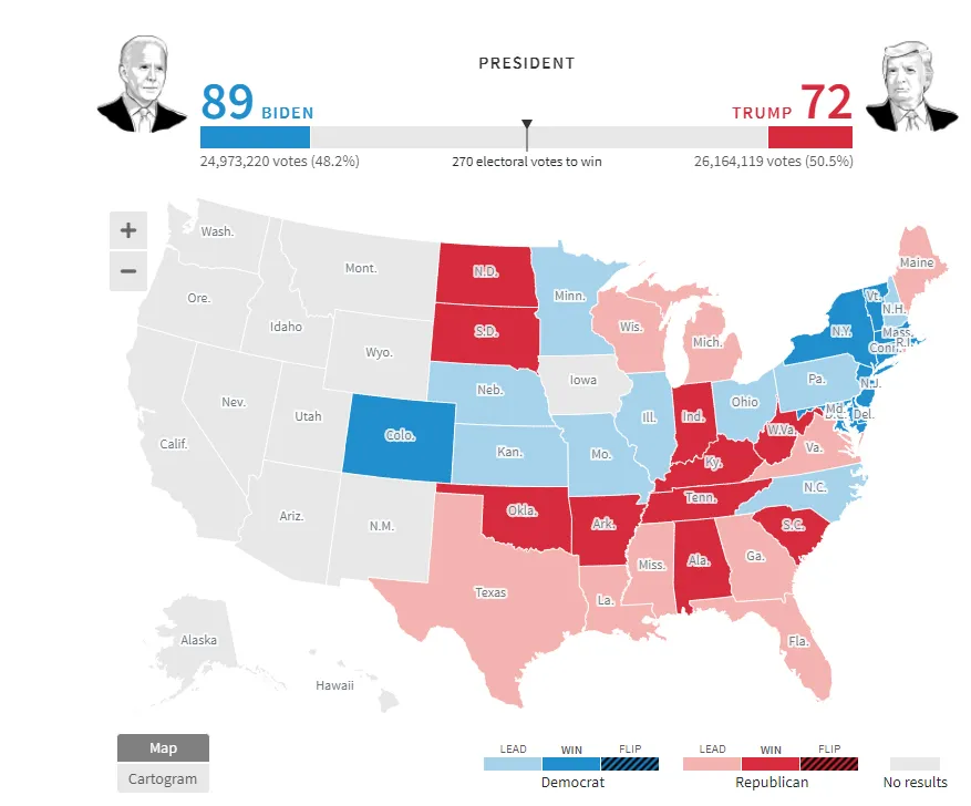 Trong khi đó, theo kết quả kiểm phiếu của CNN, Reuters, Washington Post thì hiện ứng viên Biden của Đảng Dân chủ đang có 220 phiếu đại cử tri dẫn trước đương kim Tổng thống Donald Trump của Đảng Cộng hòa 213 phiếu.